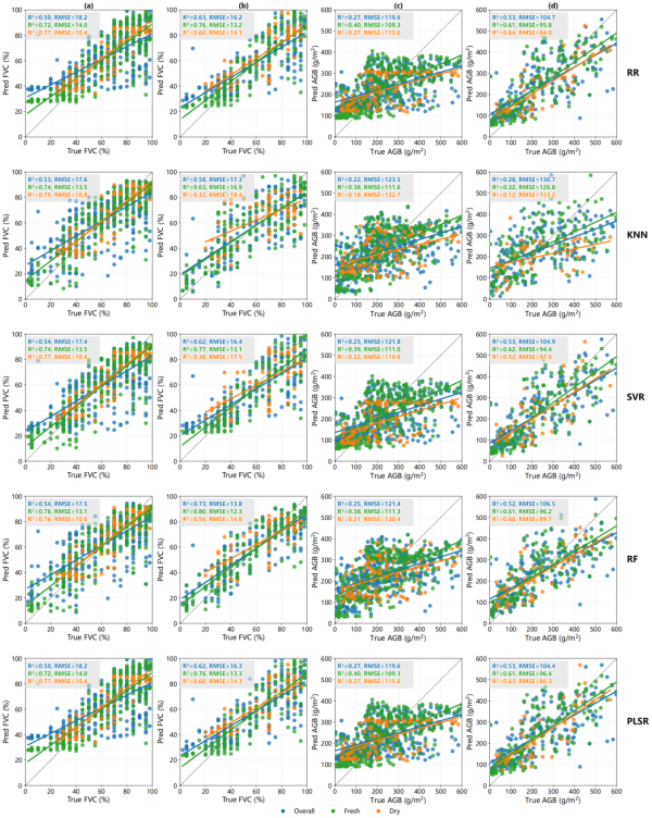 建模過程中,研究采用了五種主流回歸算法(嶺回歸、k近鄰、支持向量回歸、隨機(jī)森林和偏最小二乘回歸),并分別在兩組輸入變量上開展訓(xùn)練。結(jié)果表明,對(duì)鮮草和干草分別建模,平均可提升模型決定系數(shù)(R2)0.23,最大降低均方根誤差(RMSE)達(dá)41%。其中,融入植被高度信息對(duì)提升AGB估算精度尤為關(guān)鍵,最優(yōu)模型R2可達(dá)0.62(圖3)。該研究所提出的技術(shù)框架僅依賴輕量化RGB影像和低成本計(jì)算資源,具備實(shí)地實(shí)時(shí)應(yīng)用的巨大潛力,為多尺度草地遙感監(jiān)測與生態(tài)評(píng)估提供了新的可靠工具。