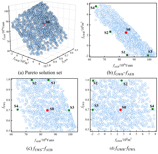 圖 2. 農(nóng)業(yè)系統(tǒng)經(jīng)濟(jì)效益(fAEB)、地下水均衡量(fGWB)和濕地生態(tài)需水量滿足度(fEWS)多目標(biāo)優(yōu)化結(jié)果帕累托三維展示(a)及投影(b-d)。S0是協(xié)調(diào)發(fā)展程度最大的解決方案;S1在與S0相同的fAEB處具有最高的fEWS;S2在與S0相同的fGWB下具有最高的fEWS;S3和S4在與S0相同的fEWS下分別具有最高的fAEB和最高的fGWB。