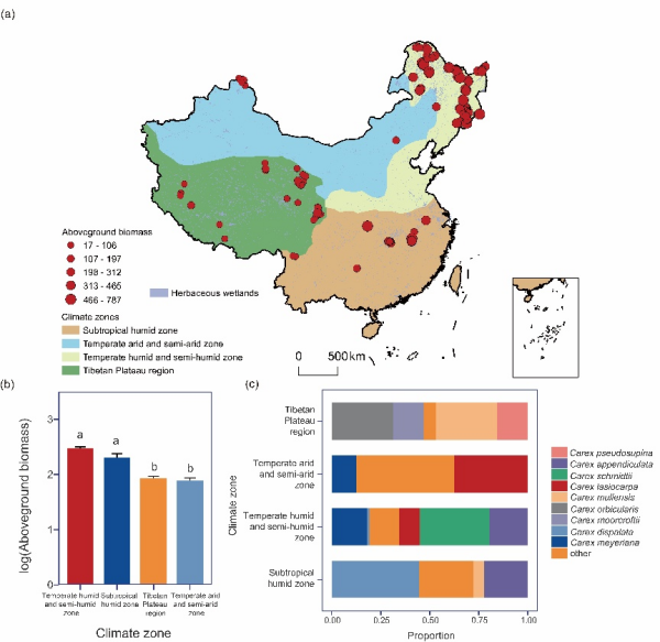地上生物量是評估生態系統結構與功能的關鍵指標。莎草類濕地(sedge wetlands)廣泛分布于全球溫帶沼澤和山地區域,具有固碳、維持生物多樣性和調節氣候等重要生態功能。然而,目前關于全國尺度莎草類濕地地上生物量分布格局及其影響機制尚不清楚。明確莎草類濕地地上生物量的空間分布及其生物和非生物影響機制,對預測濕地功能對未來環境變化的響應至關重要。