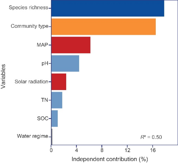 東北地理所科研人員結合國家濕地資源調查數據與遙感獲取的氣候信息數據,以我國125個典型莎草類濕地樣點為研究對象,明確了我國國家尺度濕地地上生物量的空間格局,分析了莎草類濕地植物物種豐富度與地上生物量的關系,揭示了生物和非生物因素對地上生物量的貢獻及影響機制。研究結果表明,中國不同氣候區莎草類濕地地上生物量具有顯著差異。非生物因子和生物因子共同影響莎草類濕地地上生物量。其中,生物因子在決定地上生物量分布格局中占主導地位。植物物種豐富度對地上生物量具有促進作用,而地上生物量與物種豐富度的關系受群落類型調控。此外,年平均降水量是影響莎草類濕地地上生物量空間分布的最主要非生物因子,二者呈正相關關系。土壤性質不僅直接影響地上生物量,還通過物種豐富度和群落類型間接影響地上生物量。