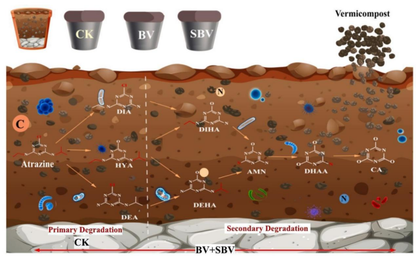 研究團(tuán)隊(duì)通過室內(nèi)盆栽實(shí)驗(yàn),結(jié)合高通量測序、液相色譜-質(zhì)譜聯(lián)用(LC-MS)和冗余分析(RDA)等技術(shù),系統(tǒng)分析了蚯蚓糞堆肥和牛糞堆肥對黑土中農(nóng)藥降解效率、微生物群落結(jié)構(gòu)及其代謝路徑的影響,并對比了不同土壤類型(黑土與鹽堿土)中堆肥的作用差異。研究明確了關(guān)鍵環(huán)境因子與微生物代謝的耦合機(jī)制,具體發(fā)現(xiàn)包括:蚯蚓糞堆肥雖未顯著提升莠去津母體的去除率,但使其初級(jí)代謝產(chǎn)物(HYA、DIA、DEA)總量降低了38.67%,并檢測到5種次級(jí)降解產(chǎn)物(如DIHA、CA等),表明其加速了莠去津的深度降解。添加蚯蚓糞堆肥使乙草胺降解率提高10.81%,半衰期縮短至8.41天,并顯著改變了細(xì)菌群落組成。在黑土中添加4%(質(zhì)量比)牛糞堆肥,可使咪唑乙煙酸降解率提高12.58%,半衰期縮短53.37%。對比發(fā)現(xiàn),土壤類型是影響修復(fù)效果的關(guān)鍵因素:在鹽堿土中,牛糞堆肥反而抑制了咪唑乙煙酸的降解。