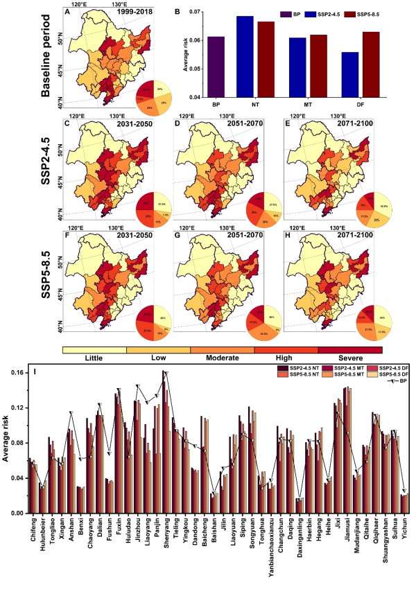 東北地理所水文與水資源學(xué)科組研究人員提出了一個(gè)綜合性的農(nóng)業(yè)水安全風(fēng)險(xiǎn)評(píng)估框架,系統(tǒng)整合了包括旱澇災(zāi)害時(shí)空特征(持續(xù)時(shí)間和強(qiáng)度)、區(qū)域氣候生產(chǎn)潛力、土地利用/覆被變化動(dòng)態(tài)以及主要糧食作物(水稻、玉米和大豆)對(duì)氣候變化的脆弱性響應(yīng)等多維度關(guān)鍵因子,構(gòu)建了適用于東北黑土區(qū)的農(nóng)業(yè)水安全風(fēng)險(xiǎn)評(píng)估框架。基于該框架,在柵格、地級(jí)市(40個(gè))和區(qū)域尺度(三大平原區(qū)與整個(gè)東北黑土區(qū))評(píng)估了基準(zhǔn)期(1999-2018年)農(nóng)業(yè)水安全災(zāi)害性、暴露度、脆弱性和風(fēng)險(xiǎn)格局;隨后,采用第六次國(guó)際耦合模式比較計(jì)劃(CMIP6)多模型集成數(shù)據(jù),模擬預(yù)測(cè)了SSP2-4.5(中等脅迫)和SSP5-8.5(高脅迫)兩種共享社會(huì)經(jīng)濟(jì)路徑下東北黑土區(qū)未來(lái)近期(2031-2050)、中期(2051-2070)和遠(yuǎn)期(2071-2100))農(nóng)業(yè)水安全災(zāi)害性、暴露度、脆弱性和風(fēng)險(xiǎn)格局的演變趨勢(shì)。