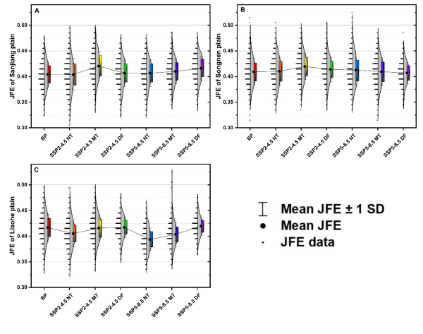圖2. 未來(lái)氣候變化下三江平原(A)、松嫩平原(B)、遼河平原(C)洪水強(qiáng)度和持續(xù)時(shí)間聯(lián)合分布概率(JFE)