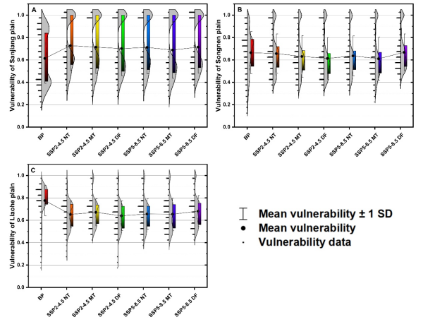 圖3. 未來(lái)氣候變化下三江平原(A)、松嫩平原(B)、遼河平原(C)農(nóng)業(yè)水安全脆弱性