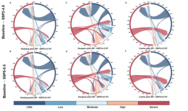 未來(lái)氣候變化下,洪澇將取代干旱成為威脅黑土糧倉(cāng)農(nóng)業(yè)水安全的主要災(zāi)害。空間格局上,基準(zhǔn)期三大平原的洪澇特征表現(xiàn)為“遼河平原>松嫩平原>三江平原”;至未來(lái)中期(2051-2070),洪水災(zāi)害分布將發(fā)生空間逆轉(zhuǎn),形成“三江平原>松嫩平原>遼河平原”的新格局。