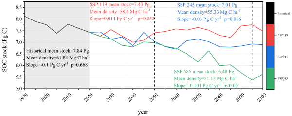研究結果表明:(1)東北地區歷史碳損失明確,1985-2020年間,東北黑土區表層SOC密度平均下降5.51 Mg C/ha,整體呈現“碳源”效應。(2)未來命運取決于排放路徑, 到2100年,在高排放路徑(SSP585)下,SOC儲量將持續流失1.8 Pg;而在低排放路徑(SSP119)下,SOC儲量則有望小幅增加0.058 Pg,并出現多次碳匯/碳源轉換的動態波動。(3)耕地與林地是調控關鍵,未來SOC變化由耕地和林地主導。耕地擴張與管理不善是導致碳損失(碳匯轉碳源)的主要因素,而林地的保護與恢復則是促進碳回收(碳源轉碳匯)的關鍵。高碳儲量的生態系統(如林地、草地)對氣候變化更為敏感,面臨更高的碳損失風險。這項研究不僅量化了不同發展路徑下黑土碳庫的響應,更指明了生態恢復與土地管理在維持碳平衡中的決定性作用。
