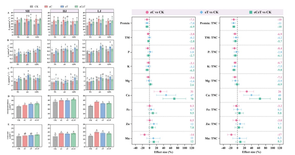 研究首先揭示了作物產(chǎn)量對氣候變化響應的復雜性。不同大豆品種對高大氣CO2濃度的產(chǎn)量響應存在巨大差異,其核心機制并非簡單的光合速率差異,也取決于植株對非結構性碳水化合物的代謝與再分配效率。高產(chǎn)響應型品種能將光合優(yōu)勢高效轉(zhuǎn)化為實際產(chǎn)量,而低響應品種則因“源-庫”關系失衡,限制了產(chǎn)量潛力(圖1)。同時,研究發(fā)現(xiàn)在高緯度東北冷涼地區(qū),適度增溫與CO2升高共同作用可使水稻平均增產(chǎn)23%,且增溫并不會削弱高CO2的施肥效應,這與在全球其他區(qū)域普遍擔憂的“增溫減產(chǎn)”趨勢形成了鮮明對比。然而,研究同樣揭示了產(chǎn)量提升背后不容忽視的另一面——作物營養(yǎng)品質(zhì)的顯著下降(圖2)。大氣CO2濃度導致的碳水化合物在籽粒中的大量積累,對蛋白質(zhì)和礦質(zhì)元素產(chǎn)生了顯著的“稀釋效應”。在高CO2環(huán)境下,水稻籽粒的蛋白質(zhì)含量平均下降了7.2%,同時多種礦質(zhì)元素含量也同步降低。值得注意的是,雖然適度增溫能夠部分緩解某些礦物質(zhì)的流失,但無法逆轉(zhuǎn)蛋白質(zhì)濃度的下降趨勢,這可能加劇未來“隱性饑餓”的風險。綜上,未來氣候變化下,東北地區(qū)作為保障國家糧食安全“穩(wěn)壓器”的戰(zhàn)略地位將得到進一步加強。但與此同時,如何協(xié)同提升產(chǎn)量與品質(zhì),將是該區(qū)域乃至全球農(nóng)業(yè)應對氣候變化必須解決的重大挑戰(zhàn)。