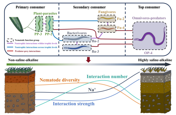研究團隊沿鹽堿梯度設置了非鹽堿化、弱鹽堿化、中度鹽堿化和高度鹽堿化四個等級的土壤樣點。通過將線蟲按取食行為和生活史策略劃分為不同功能群,并根據(jù)各功能群所處生態(tài)位進一步將功能群間的相互作用劃分為三類:營養(yǎng)級內(nèi)非營養(yǎng)相互作用、跨營養(yǎng)級非營養(yǎng)相互作用以及捕食者-被捕食者相互作用,系統(tǒng)構建了線蟲功能群網(wǎng)絡。