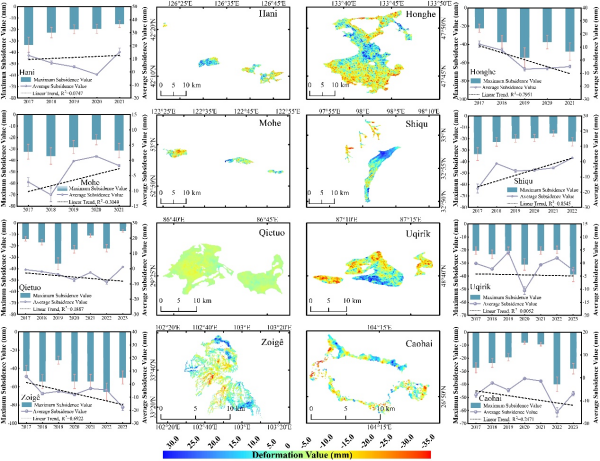 研究團隊融合小基線集(SBAS-InSAR)時序干涉技術與機器學習模型,基于2017–2023年Sentinel-1衛(wèi)星C波段雷達影像,實現(xiàn)了全國尺度泥炭地地表形變的高精度反演與預測,系統(tǒng)揭示了其空間格局與主要驅動機制。結果表明,我國泥炭地沉降現(xiàn)象普遍存在:若爾蓋泥炭地平均沉降速率為?5.73 mm/a,最大沉降量超過?65 mm;草海泥炭地最大沉降速率達?39.91 mm/a;大興安嶺地區(qū)受多年凍土退化影響出現(xiàn)緩慢沉降,而長白山部分泥炭地則保持穩(wěn)定。