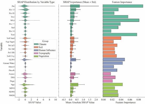 泥炭地垂直退化驅動分析結果表明,降水量(Pre,SHAP = 0.719)是影響泥炭地沉降的首要因子,凈初級生產力 (NPP,SHAP =0.600) 、干旱指數(shù) (SPEI,SHAP =0.554)和牲畜密度 (Livestock density,SHAP=0.427) 緊隨其后。氣候干旱化與放牧擾動的疊加是驅動西部泥炭地垂直退化的關鍵機制,而凍土退化則成為寒區(qū)泥炭地的新型驅動力。