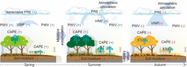圖1 中國溫帶植被物候提前對降雨影響的物理機制示意圖