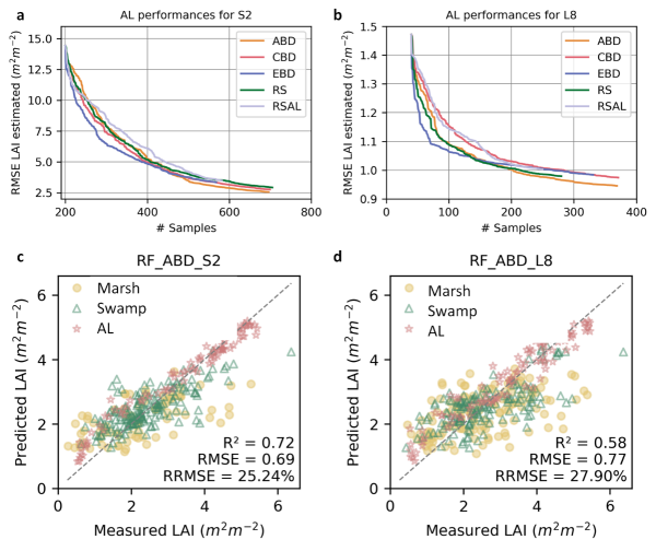 為解決上述科學問題,中國科學院東北地理所濕地遙感研究團隊基于多年野外原位數據積累與多源遙感數據,率先構建了一套面向全國尺度的濕地LAI混合反演與制圖方法框架,實現了我國國家尺度濕地植被生態參數、10 m空間分辨率的突破。該研究整合了2013–2023年期間我國不同濕地植被類型的865組野外實測LAI數據,通過遙感云計算平臺融合多源衛星影像(Sentinel-2與Landsat-8),創新性地提出一種“物理模型+主動學習+機器學習回歸”的混合建模策略。通過經典輻射傳輸模型(PROSAIL-5B)增強模型可解釋性,采用主動學習技術優化訓練樣本分布,緩解病態反演和樣本冗余問題,提高復雜濕地生物群系下的模型泛化能力,結合隨機森林機器學習算法建立高效穩健的LAI反演模型。