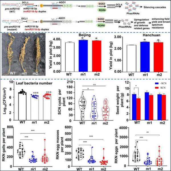 與野生型大豆相比,amiR2118a/b突變體的pre-amiR2118a/b二級(jí)結(jié)構(gòu)發(fā)生顯著改變,同時(shí)成熟miR2118a/b的表達(dá)水平顯著下調(diào),導(dǎo)致下游介導(dǎo)的phasiRNAs生物合成也受到顯著抑制。無(wú)論在正常條件下還是接種細(xì)菌性斑點(diǎn)病菌Pseudomonas syringae pv. glycinea (Psg)后,amiR2118a/b突變體內(nèi)與光合作用、脂肪酸合成相關(guān)基因,以及防御反應(yīng)相關(guān)基因(如抗線蟲關(guān)鍵基因GmSNAP18)均呈顯著上調(diào)表達(dá),使得植株處于防御“預(yù)警”狀態(tài)。值得注意的是,amir2118a/b雙突變體m1和m2對(duì)葉際細(xì)菌病害Psg和土傳線蟲病害(大豆胞囊線蟲和根結(jié)線蟲)表現(xiàn)出抗性增強(qiáng),實(shí)現(xiàn)了對(duì)地上部與地下部病害的跨類型防控。兩年田間試驗(yàn)證實(shí),突變體單株莢數(shù)、粒數(shù)、粒重均顯著優(yōu)于野生型,小區(qū)測(cè)產(chǎn)實(shí)現(xiàn)7.4%-8.7%的穩(wěn)定增產(chǎn),成功打破了抗病性與產(chǎn)量的協(xié)同限制。本研究提出了一種作物復(fù)雜性狀改良的可行策略,即利用CRISPR/Cas系統(tǒng)精準(zhǔn)靶向miRNAs非功能區(qū)進(jìn)行突變,通過(guò)調(diào)控phasiRNA級(jí)聯(lián)效應(yīng)進(jìn)而提升大豆抗病性與產(chǎn)量(圖1)。