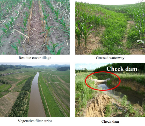 圖1 研究區(qū)BMPs應(yīng)用情況。Residue cover tillage:秸稈覆蓋耕作;Grassed waterway:植草溝渠;Vegetative filter strips:植被過(guò)濾帶;Check dem:谷坊