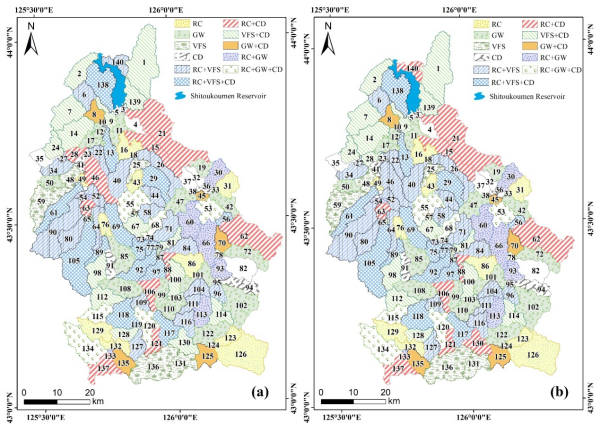 針對(duì)上述問(wèn)題,中國(guó)科學(xué)院東北地理與農(nóng)業(yè)生態(tài)研究所水環(huán)境污染與防治學(xué)科組以長(zhǎng)春市重要飲用水源地—石頭口門(mén)水庫(kù)上游流域?yàn)檠芯繉?duì)象,綜合運(yùn)用土壤與水評(píng)估工具(SWAT)模型與非支配排序遺傳算法II(NSGA-II),開(kāi)展了流域尺度上面源污染控制措施的多目標(biāo)優(yōu)化研究。研究評(píng)估了四種典型BMPs:秸稈覆蓋耕作(RC)、植草水道(GW)、植被過(guò)濾帶(VFS)和谷坊(CD)在不同組合情景下的污染負(fù)荷削減效能,并首次將實(shí)施成本、土地占用與污染削減效率納入統(tǒng)一優(yōu)化框架。