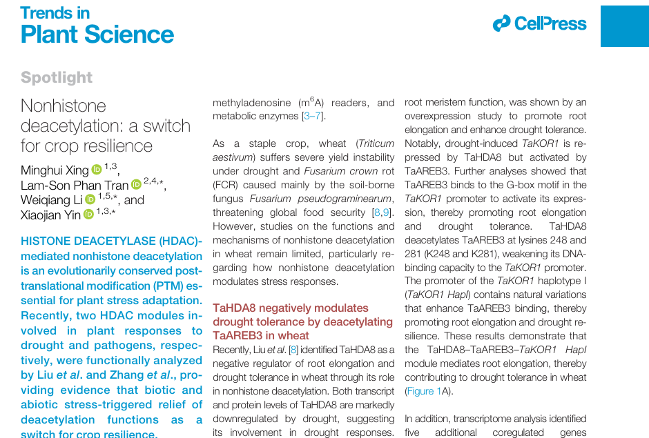 團隊以Nonhistone deacetylation: a switch for crop resilience為題發表于Trends in Plant Science的 Spotlight文章指出,組蛋白去乙酰化酶(HDAC)介導的非組蛋白去乙酰化在作物逆境響應中充當重要的分子開關。在小麥中,組蛋白去乙酰化酶TaHDA8通過去乙酰化轉錄因子TaAREB3抑制根系伸長,從而負調控抗旱性,但干旱脅迫會抑制TaHDA8的蛋白豐度;組蛋白去乙酰化酶TaSRT1通過去乙酰化熱激蛋白TaHSP18.6抑制生長素信號,進而負調控鐮刀菌冠腐病抗性,而病原侵染同樣會降低TaSRT1的蛋白豐度。由此,生物脅迫與非生物脅迫觸發的“去乙酰化作用解除”可作為提升作物抗逆性的調控開關,為抗逆育種提供了可模塊化利用的新靶點。