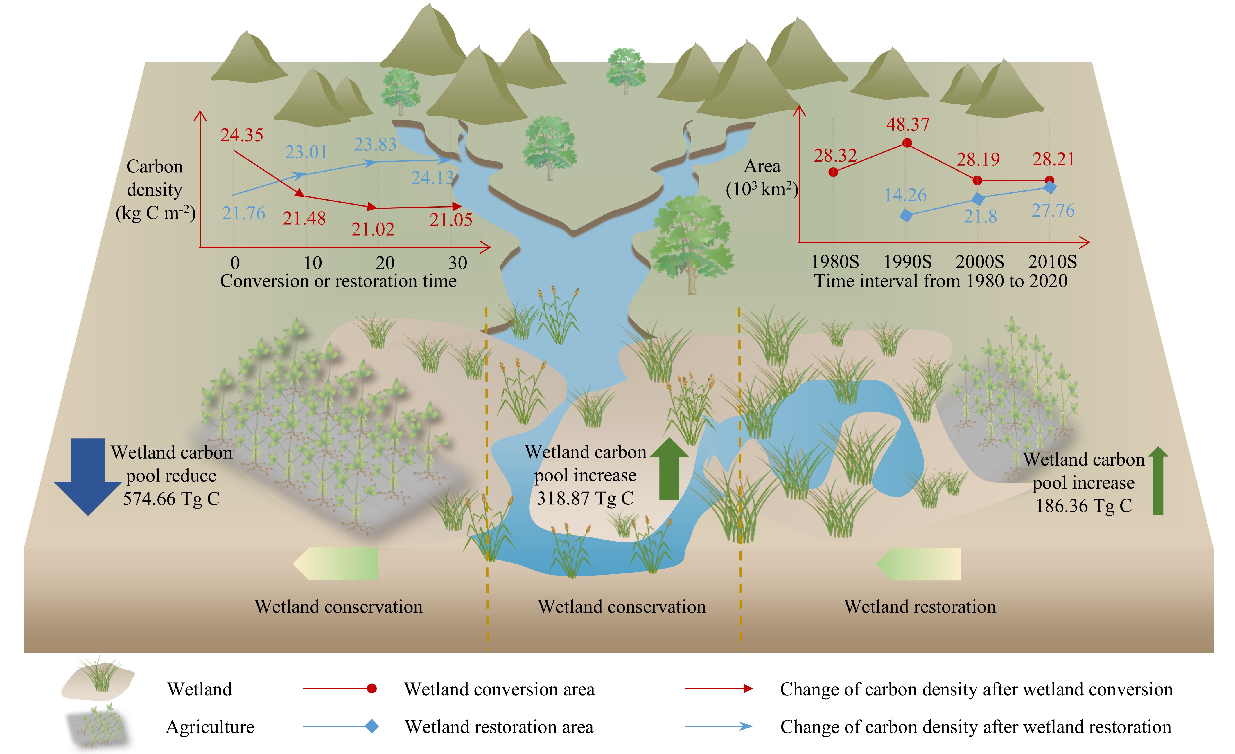 研究結果表明:在研究期內,我國濕地農田化導致了明顯的土壤有機碳損失,其中約86%的碳損失發生在轉化后的前10年,隨后下降速度減緩并逐漸趨于穩定。在這四十年間,濕地農田化導致累計碳損失約 574.66 Tg C,相當于全國濕地土壤碳庫的約 10.6%。相比之下,濕地恢復(退耕還濕)促進了土壤有機碳的增加,盡管水平仍低于改造前的水平。保護和恢復措施能夠共同抵消濕地農田化所導致的一多半碳損失;其中,恢復措施貢獻了 186.36 Tg C碳增加(約占濕地土壤碳庫的 3.43%),抵消了約 32.4%的濕地農田化導致的碳損失。
