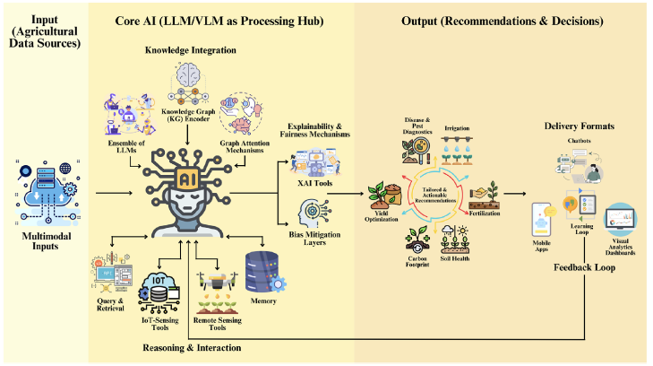 大語言模型與視覺-語言模型的協同融合,能夠實現對多模態數據的深度解析。視覺-語言模型融合圖像與文本編碼器,可聯合處理高分辨率作物影像與田間記錄,突破單視覺模型的泛化能力局限。同時,大語言模型憑借其在語義推理與少樣本學習方面的優勢,可完成文獻挖掘、性狀描述與標注、診斷報告生成等任務。檢索增強生成技術(RAG)的融入,進一步提升了結果的可靠性,緩解了模型幻覺問題。