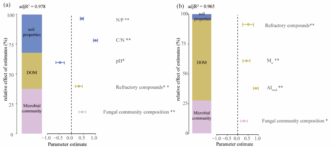 圖2 多元線性回歸結(jié)合層次分割法解釋土壤理化性質(zhì)、微生物群落及DOM對(duì)表土(a)和底土(b)中MNC積累的相對(duì)貢獻(xiàn)