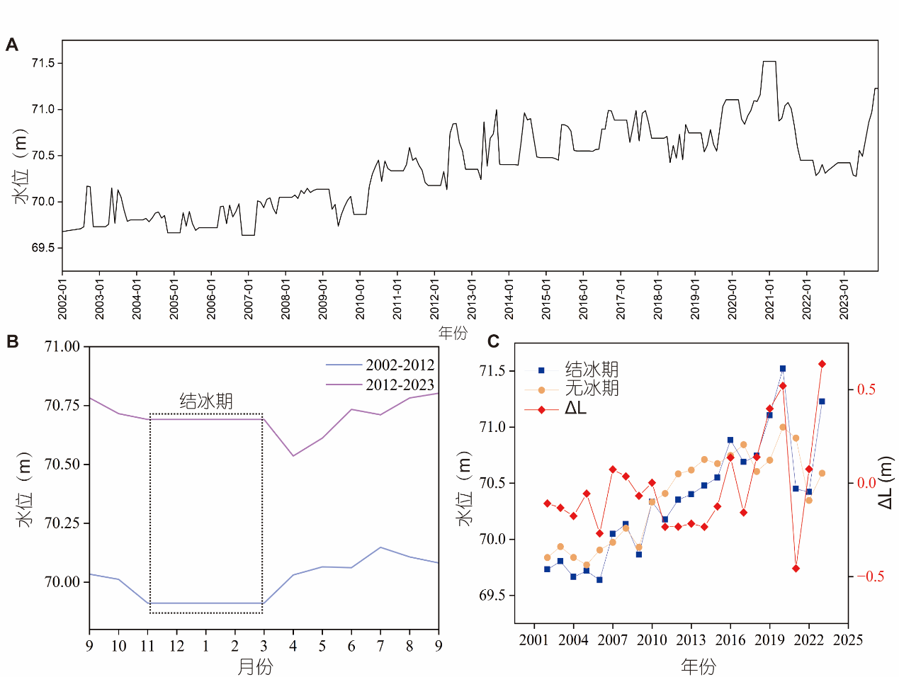 圖1 興凱湖水位變化趨勢。(A)2002–2023年水位月變化;(B)2002–2012年及2012–2023年興凱湖月均水位變化,虛線表示結(jié)冰期湖水位;(C)2002–2023年興凱湖結(jié)冰期(11月至次年3月)與無冰期(4–10月)的年均水位變化,紅色實(shí)線代表無冰期與結(jié)冰期水位差的年變化(前者減去后者)。