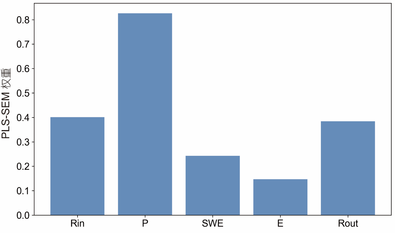 圖 2 入湖徑流量(Rin)、降水量(P)、積雪水當(dāng)量(SWE)、湖面蒸發(fā)量(E)以及出湖徑流量(Rout)對興凱湖水位變化的PLS-SEM權(quán)重分析。