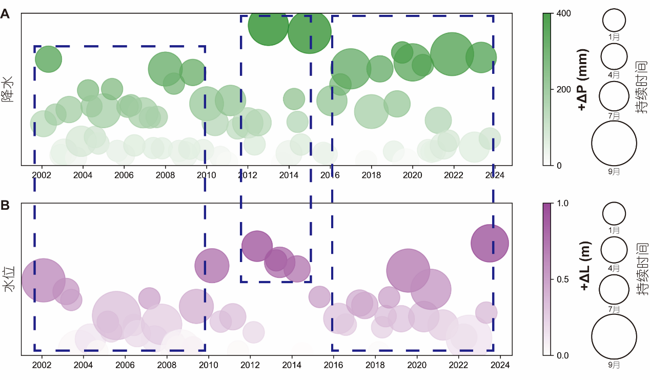 圖3 2002–2023年興凱湖流域連續(xù)降水增加事件變化與湖泊水位波動之間的關(guān)系。(A)興凱湖流域連續(xù)降水上升事件的幅度與持續(xù)時間;(B)興凱湖水位連續(xù)上升事件的幅度與持續(xù)時間。藍(lán)色虛線框表示降水(或水位)顯著增加且持續(xù)時間較長的時期。+ΔP表示連續(xù)降雨增加時期內(nèi)事件的極大值與極小值之差;+ΔL表示湖水位連續(xù)上升時期內(nèi)的事件極大值與極小值之差。每個陰影圓表示一次獨(dú)立的連續(xù)降水增加事件或水位上升事件。圓圈的大小表示事件的持續(xù)時間,顏色深淺表征降水或水位的峰值增幅。需要注意的是,圖中圓圈的重疊是可視化的展示,并不意味著事件同時發(fā)生。氣泡越大表示持續(xù)時間越長;氣泡顏色越深表示水位或降水的峰值增幅越大。