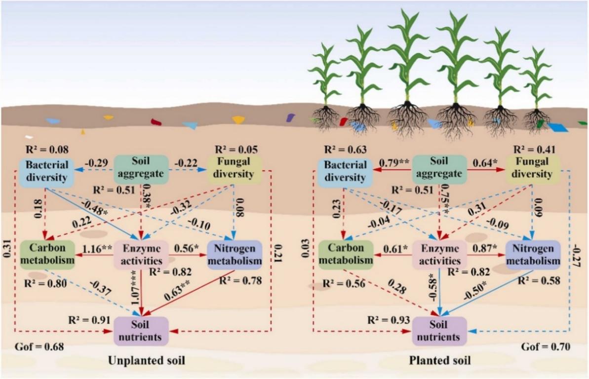 此外,研究人員比較了有無玉米種植條件下可降解聚乳酸微塑料(PLA MPs)對農田土壤生態(tài)過程的擾動效應。結果發(fā)現(xiàn),PLA MPs顯著影響土壤碳氮養(yǎng)分供給格局、土壤團聚體組成及微生物功能過程,但其生態(tài)效應在不同種植條件下表現(xiàn)出明顯差異。在無植物條件下,PLA MPs整體上促進了土壤微生物碳氮代謝;而在玉米種植條件下,這種促進效應明顯減弱,部分指標甚至呈現(xiàn)相反變化。進一步分析表明,作物根際過程以及植物與微生物之間的養(yǎng)分競爭,是調控PLA MPs生態(tài)效應的重要機制。