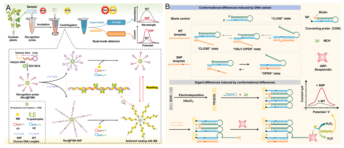 研究團隊創(chuàng)新性地開發(fā)了多種基于構(gòu)象調(diào)控、競爭性識別及無酶信號放大的新型生物傳感平臺,為解決傳統(tǒng)檢測方法依賴大型儀器、成本高昂及特異性不足等問題提供了全新框架。具體核心突破如下:(1)為了擴大SNP檢測窗口并提升單堿基突變的識別特異性,團隊提出競爭性探針設(shè)計與構(gòu)象能壘調(diào)控,阻斷了復(fù)雜樣本背景下的非特異性激活干擾,實現(xiàn)了極高的單堿基識別特異性。(2)針對復(fù)雜樣本背景下“低豐度靶標(biāo)捕獲”和“信號放大”的技術(shù)瓶頸,團隊開發(fā)了基于納米酶催化的雙模自驗證機制,以及無酶級聯(lián)放大系統(tǒng),成功實現(xiàn)了極低豐度SNP的高靈敏檢測。(3)為解決傳統(tǒng)檢測成本高的實際挑戰(zhàn)。團隊提出探針可重置設(shè)計實現(xiàn)降本增效。以上傳感平臺已成功應(yīng)用于大豆基因型中,實現(xiàn)了與大豆葉片形態(tài)等關(guān)鍵表型相關(guān)SNP位點的精準(zhǔn)鑒定。