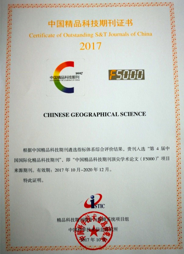 2017年10月31日,中國科學技術信息研究所在北京國際會議中心舉辦了“2017年中國科技論文統計結果發布會”。東北地理所主辦的期刊《地理科學》和《Chinese Geographical Science》分別入選“第4屆中國精品科技期刊”和“第4屆中國國際化精品科技期刊”,即“中國精品科技期刊頂尖學術論文(F5000)”項目來源期刊,有效期為2017年10月—2020年12月。