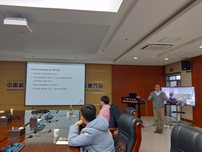 劉福來以“CO2 elevation modulates leaf gas exchange response to drought in C3 and C4 monocots and dicots species” 為題,通過兩個科學問題的提出與破解為主線,在試驗設計、試驗方法方面進行了深入講解,向現場的科研人員和研究生介紹自己最新的研究成果,并且與現場的科研人員進行了熱烈的交流和討論,使到場參加本次講座的科研人員和研究生受益匪淺。