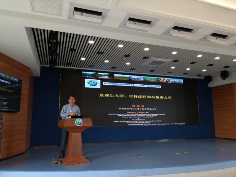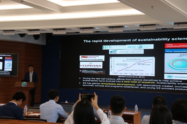 本屆研討會邀請到了國際著名景觀生態(tài)學與可持續(xù)性研究專家、美國亞利桑那州立大學可持續(xù)性科學學院鄔建國教授,鄔教授應邀做了題為“景觀生態(tài)學、可持續(xù)性科學與生態(tài)文明”的特邀報告,就景觀生態(tài)學、可持續(xù)性科學和生態(tài)文明間的內(nèi)涵及內(nèi)在聯(lián)系做了詳細介紹,并就報告內(nèi)容與在場青年學者進行了廣泛和深入的交流。鄔教授特別勉勵可持續(xù)性研究青年學者積極投身祖國的“美麗中國”和“生態(tài)文明”并做出應有貢獻。