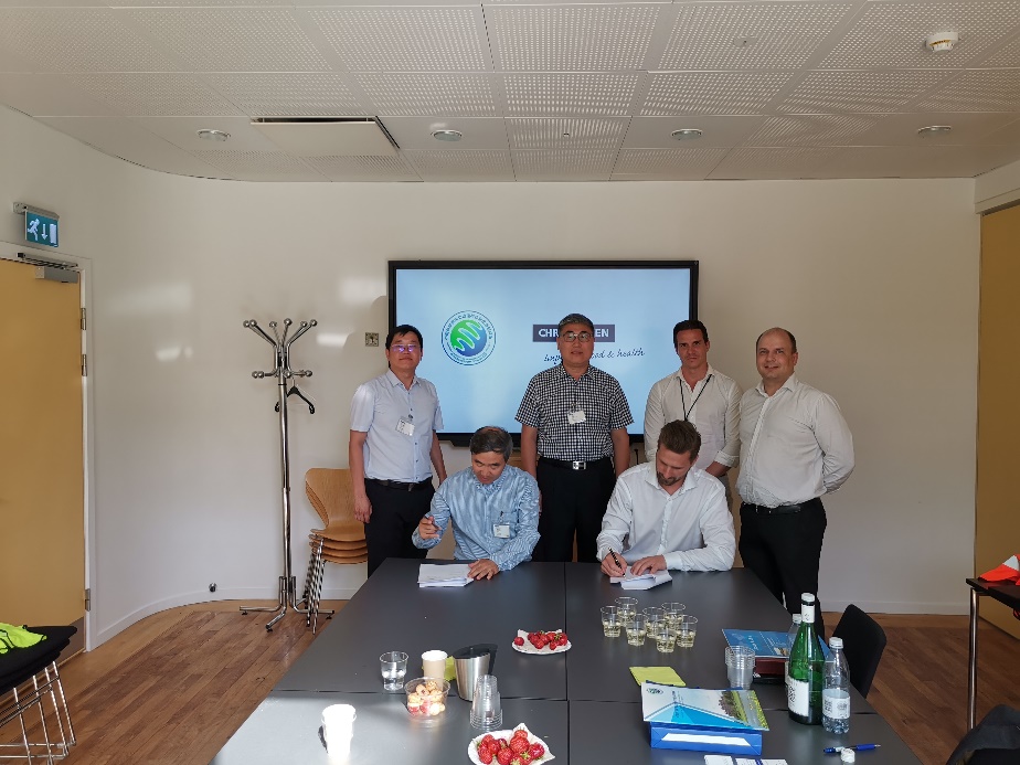 6月24日至25日,何興元所長(zhǎng)一行應(yīng)丹麥CHR-HANSEN集團(tuán)邀請(qǐng),考察了集團(tuán)位于丹麥Hvidovre的有益菌劑生產(chǎn)基地及植物創(chuàng)新研發(fā)中心。期間,何興元所長(zhǎng)介紹了我所基本情況及我所在農(nóng)業(yè)研究領(lǐng)域所取得的主要成果,CHR-HANSEN基地負(fù)責(zé)人Kim Muller Christensen博士介紹了CHR-HANSEN集團(tuán)的發(fā)展歷程及在全球范圍的經(jīng)營(yíng)情況、科技創(chuàng)新布局等,植物創(chuàng)新研發(fā)中心主管Lars Molbak博士介紹了Plant Health Innovation研發(fā)中心的基本情況及未來的合作方向。李向楠研究員就其承擔(dān)的CHR-HANSEN首個(gè)中國(guó)項(xiàng)目情況進(jìn)行了介紹。會(huì)議中,何興元所長(zhǎng)與CHR-HANSEN集團(tuán)簽署了科技創(chuàng)新合作協(xié)議,雙方將以合作研究項(xiàng)目為契機(jī),進(jìn)一步加大科研合作。會(huì)后,何興元所長(zhǎng)一行在CHR-HANSEN基地負(fù)責(zé)人等陪同下考察了CHR-HANSEN有益菌劑生產(chǎn)線。