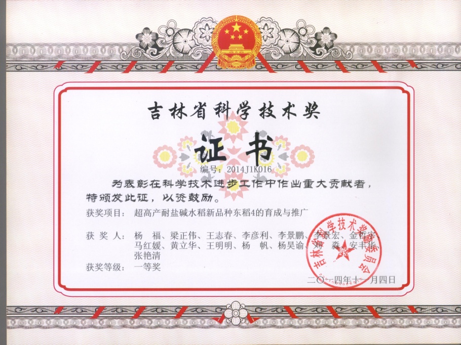 楊福團隊采用地理遠緣雜交、穿梭育種等先進育種技術,歷時16年成功育成東稻4號水稻新品種。該品種集高產、優質、多抗、理想株型及廣適性于一體,尤其是耐鹽堿性和抗稻瘟病性,均明顯優于吉林省其他主推品種;2010年獲吉林省水稻新品種高產競賽一等獎,畝產849.37公斤,創吉林省歷史最高紀錄;2011年獲全國優質食味粳稻品評一等獎。東稻4已成為吉林省中早至中熟的主推品種,2010-2014年在吉林省累計種植面積達367萬畝,在全國其他適宜地區推廣170萬畝,社會經濟效益極其顯著。該成果為水稻育種親本應用、育種方法和鑒定技術的改進提高奠定了基礎,對推動吉林省水稻生產發展,保證國家糧食安全具有重要作用。
