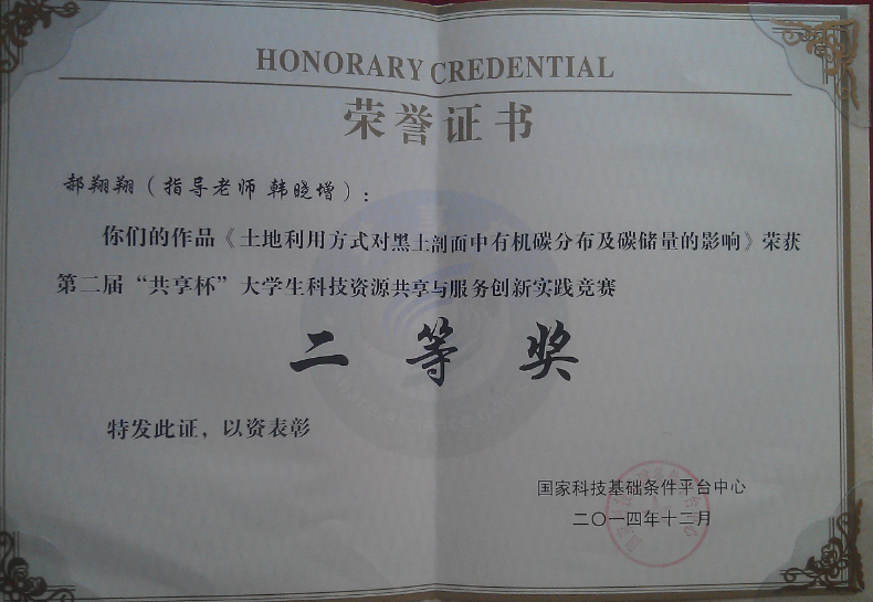 中國生態(tài)系統(tǒng)研究網(wǎng)絡(luò)是國家科技基礎(chǔ)條件平臺中心54個資源平臺之一,海倫農(nóng)業(yè)生態(tài)實驗站做為中國生態(tài)系統(tǒng)研究網(wǎng)絡(luò)的成員,通過國家科技基礎(chǔ)條件平臺中心向全社會開放了水分、土壤、氣象和生物等長期生態(tài)監(jiān)測數(shù)據(jù)。此次“共享杯”大學(xué)生競賽,郝翔翔以海倫站不同土地利用方式下的典型黑土為對象,研究了其剖面有機碳的分布及儲量,為黑土區(qū)固碳研究提供參考數(shù)據(jù)的同時,也通過“共享杯”大學(xué)生競賽宣傳了海倫站。