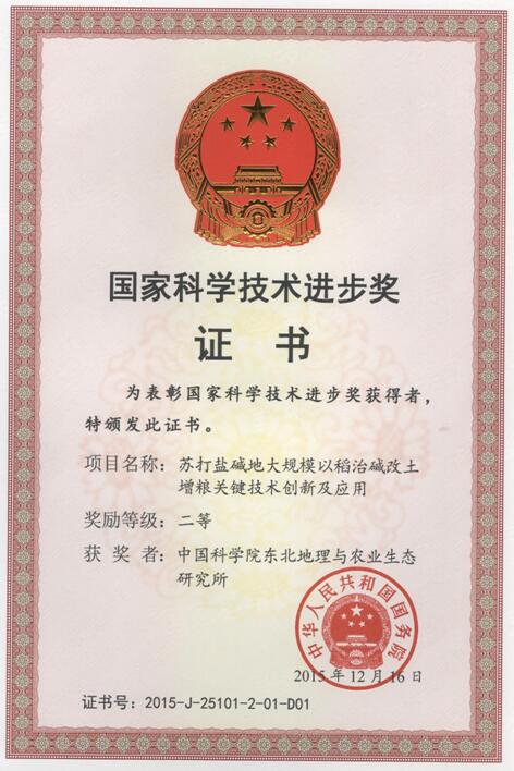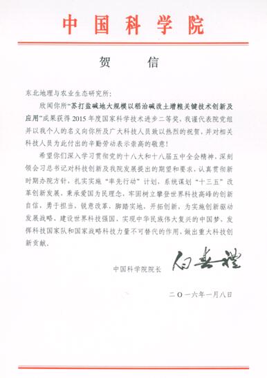 其中,由中國科學(xué)院東北地理與農(nóng)業(yè)生態(tài)研究所為第一完成單位,吉林省農(nóng)業(yè)科學(xué)院、吉林農(nóng)業(yè)大學(xué)、吉林省白城市農(nóng)業(yè)科學(xué)院以及通化市農(nóng)業(yè)科學(xué)研究院等5家單位共同參與完成的“蘇打鹽堿地大規(guī)模以稻治堿改土增糧關(guān)鍵技術(shù)創(chuàng)新及應(yīng)用”重大成果獲2015年度國家科技進(jìn)步獎(jiǎng)二等獎(jiǎng)。項(xiàng)目第一完成人梁正偉研究員代表獲獎(jiǎng)項(xiàng)目組出席了獎(jiǎng)勵(lì)大會(huì),受到了習(xí)近平主席、李克強(qiáng)總理等黨和國家領(lǐng)導(dǎo)人的親切接見并合影留念。1月8日中國科學(xué)院院長(zhǎng)白春禮院士也向我所發(fā)來了賀電。