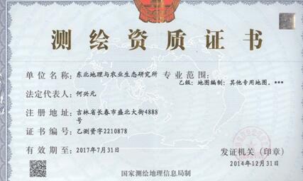 同時(shí),我所遙感與地理信息中心于2015年完成了ISO9001質(zhì)量管理體系認(rèn)證,并與行業(yè)管理部門---吉林省測(cè)繪地理信息局積極溝通,順利完成了測(cè)繪乙級(jí)資質(zhì)的換證工作。我所繼續(xù)持有測(cè)繪資質(zhì)證書,為我所科研人員從事相關(guān)工作提供了重要的資質(zhì)依據(jù),為申請(qǐng)和承擔(dān)相關(guān)科研和生產(chǎn)任務(wù)提供了平臺(tái)基礎(chǔ)。