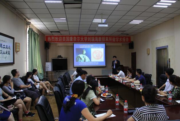2016年8月2日,應東北地理所野生植物資源保護與利用課題團隊趙恒田研究員邀請,美國康奈爾大學食品科學系終身教授(兼毒理系教授)、國際食品科學學院院士劉瑞海在農業技術中心做了關于“植物活性物質對慢性病預防” 的學術報告。