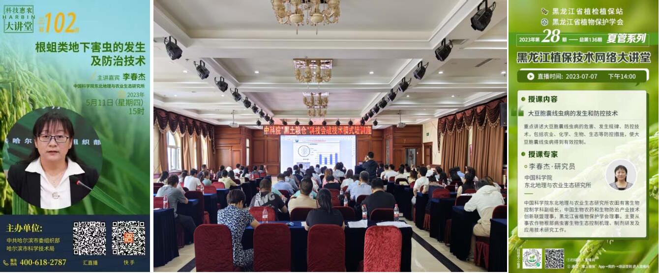 應哈爾濱市科技局、齊齊哈爾市科技局、黑龍江省植物保護學會和黑龍江省植檢植保站的邀請,針對當前農作物病蟲害發生特點和防治過程中存在的問題,李春杰分別于5月11日在“科技惠農大講堂”講解了“根蛆類地下害蟲的發生和防治技術”、6月29日在“中科院專家鶴城交流培訓會”上交流了“農作物根部病蟲害生防制劑的研發和應用”、7月7日在“黑龍江植保技術網絡大講堂”上講解了“大豆胞囊線蟲病的發生和防控技術”。李春杰宣講的“黑土糧倉”科技會戰的重要科技成果,主要涉及東北地理所自主研發的昆蟲病原線蟲生物殺蟲劑及其應用技術、間套作蔥屬作物對線蟲病的防控技術等生物生態控制機理和應用示范推廣效果等,為糧食安全生產和土壤健康、環境友好提供了保障,使農作物產能得到提升。