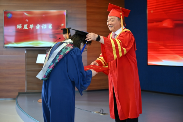 在學位授予儀式環節中,畢業生依次上臺,姜明為全體畢業生頒發了畢業證書,并為畢業生扶正流蘇,合影留念。